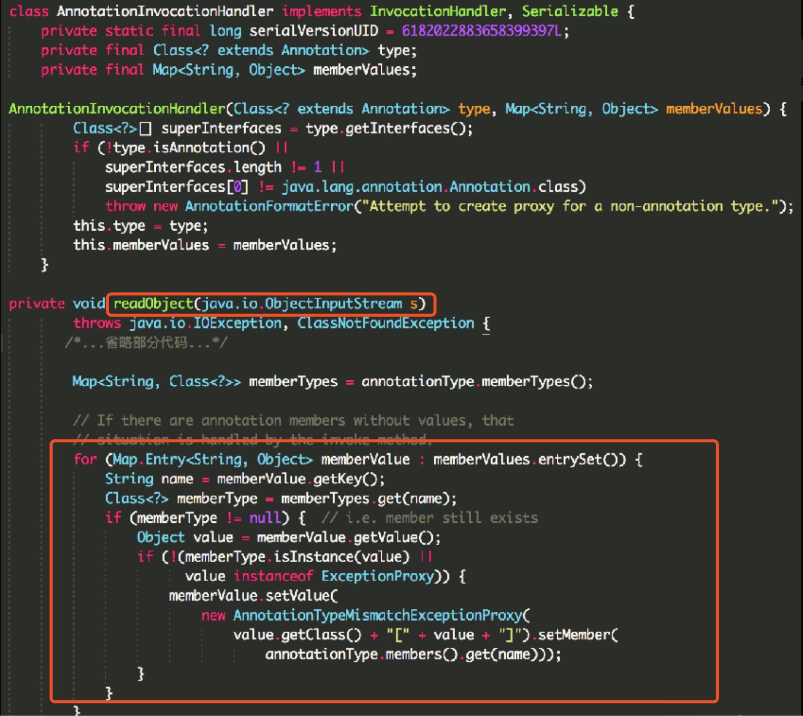 # 回顾上一步的代码:需要在readObject时造成代码的执行,需要满足如下2个条件,1 是重写readObject方法,2.方法对map的键值操作进行修改