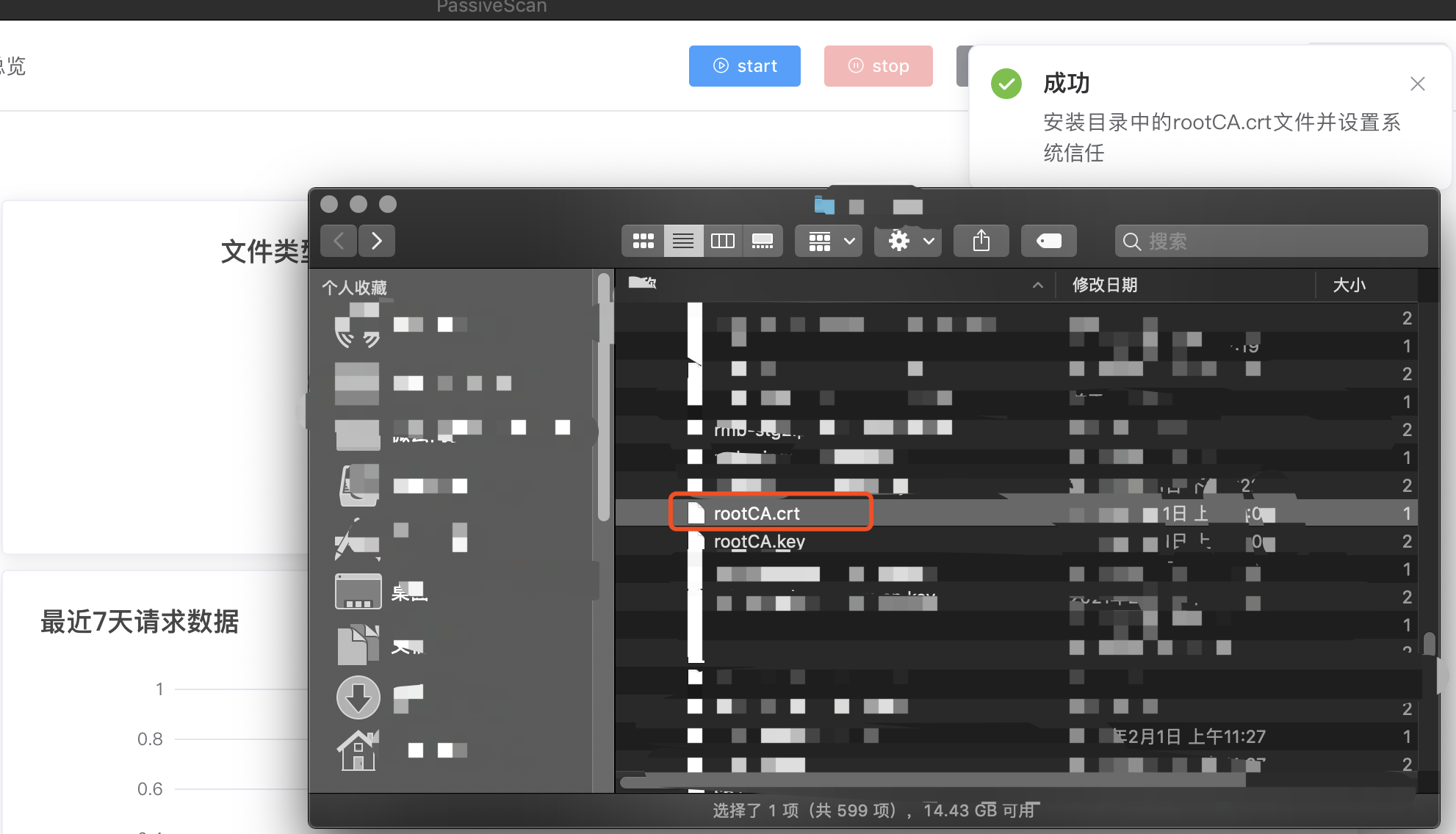 点击右上角"安装证书"后弹出证书所在位置,安装certificates/rootCA.crt后设置为信任